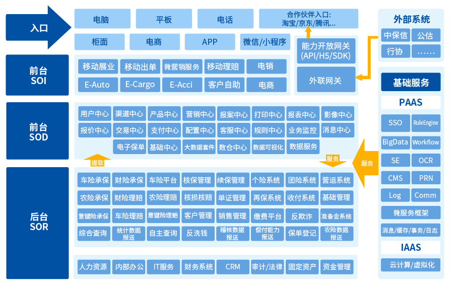 根據(jù)Gatner在2016年提出的一份《Pace-Layered Application Strategy》報(bào)告,按照“步速”將企業(yè)的應(yīng)用系統(tǒng)劃分為三個(gè)層次,SOR(Systems of record ),SOD(Systems of differentiation)和SOI(Systems of innovation),保險(xiǎn)企業(yè)的整體架構(gòu)可按前臺(tái)、中臺(tái)和后臺(tái)相對應(yīng)進(jìn)行劃分。
