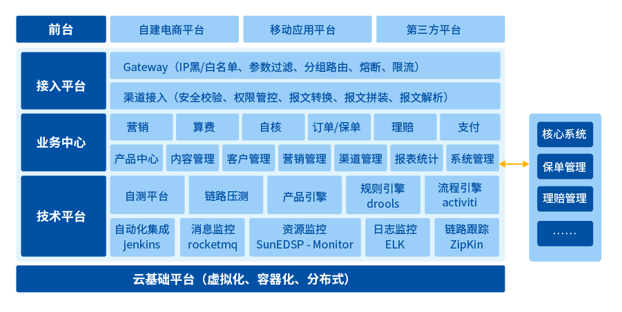 長亮保泰團(tuán)隊(duì)根據(jù)多年互聯(lián)網(wǎng)保險(xiǎn)系統(tǒng)建設(shè)經(jīng)驗(yàn),重點(diǎn)關(guān)注保險(xiǎn)業(yè)務(wù)創(chuàng)新支持,打造一個(gè)產(chǎn)品工廠+多渠道接入+互聯(lián)網(wǎng)平臺(tái)的中臺(tái)架構(gòu),逐步形成企業(yè)級(jí)的業(yè)務(wù)能力和技術(shù)能力復(fù)用平臺(tái),如下圖所示: